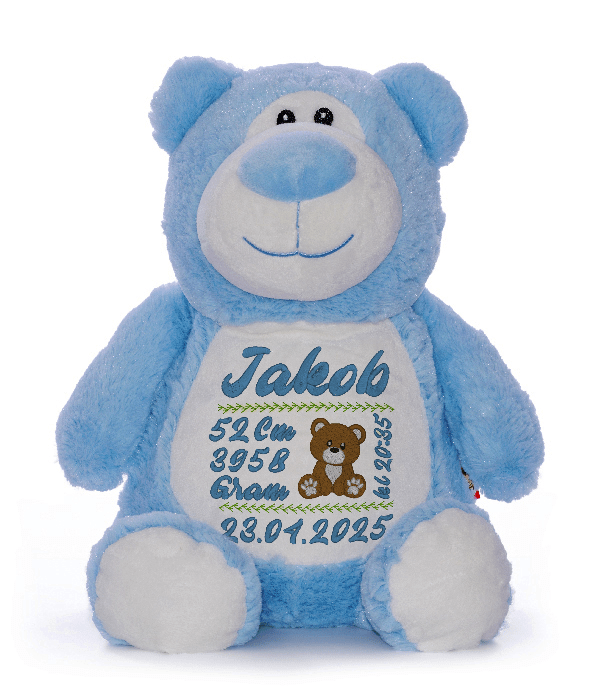 Gjør gaven ekstra spesiell med denne nydelige, blå bamsen med brodert navn og dato på magen. En personlig og hjertevarm gave som passer perfekt til dåp, barsel eller bursdag.