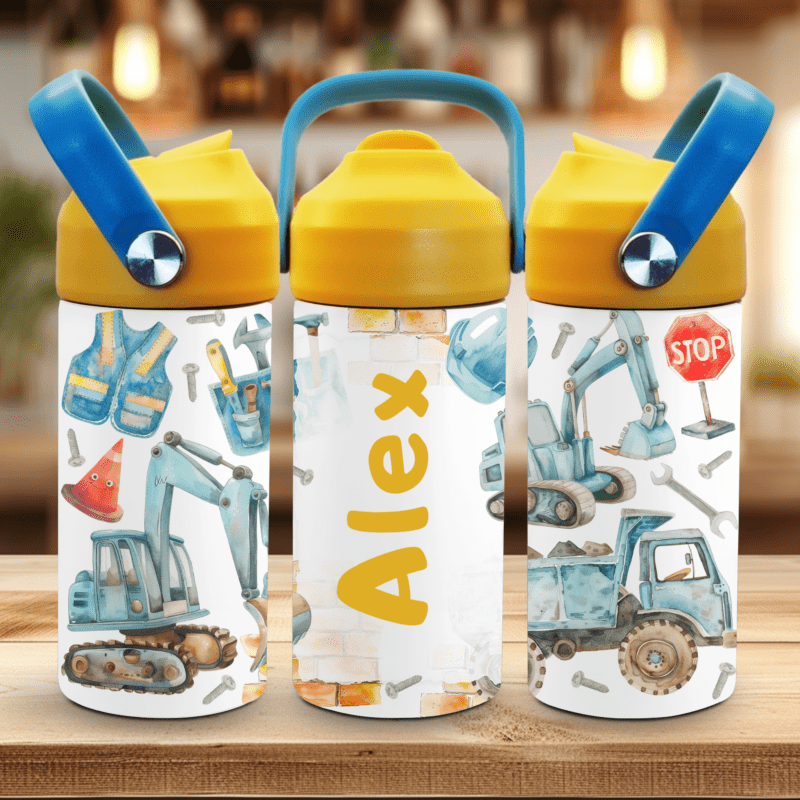 For små som elsker store kjøretøy! Denne personlige drikkeflasken med navn har kult motiv med gravemaskin og lastebiler i blå toner. Velg selv farge og font på navnet, slik at flasken blir barnets helt egen. Med flip-top tut og god isolasjon er den perfekt til barnehage, skole og turer – kald drikke i 8 timer og varm i 4 timer.