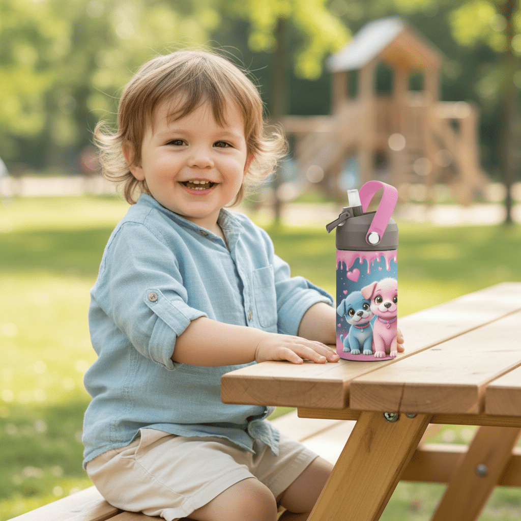 Drikkeflaske med navn er perfekt for små dyrevenner! Flasken har en herlig tegning av tre søte valper på den ene siden, og barnets navn trykkes på den andre.