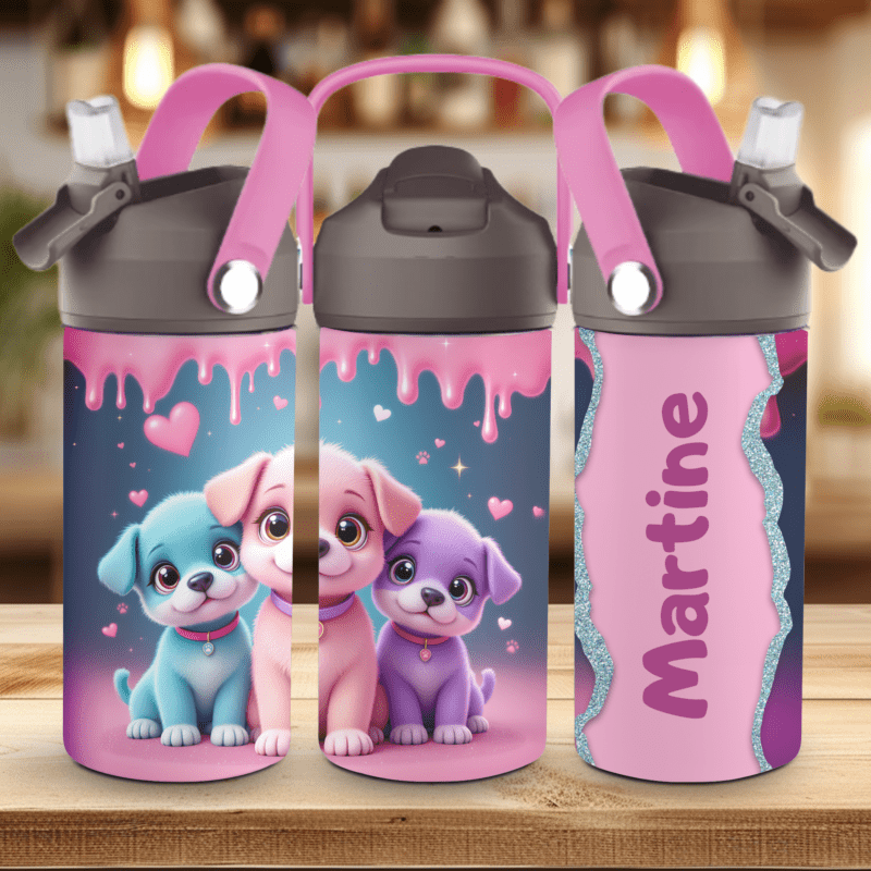 🐶 Drikkeflaske med navn – Tre søte valper