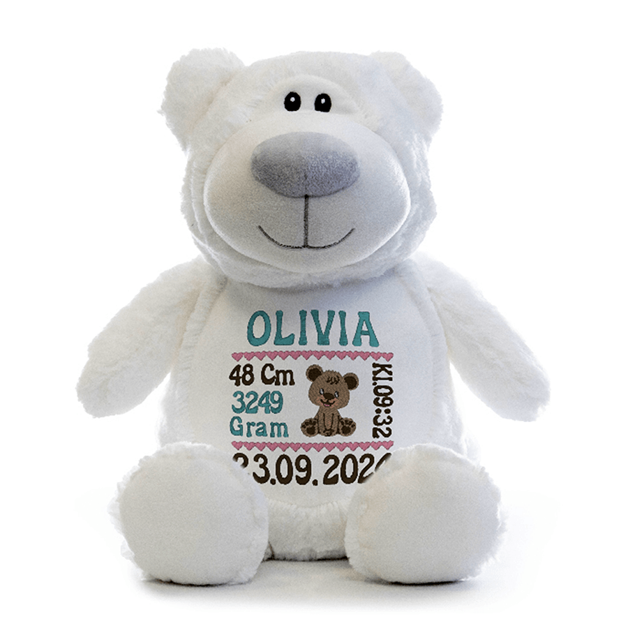 Hvit bamse med navn og dato brodert på magen. Den har ingen løse deler og er testet og sertifisert for alle aldre. Innmaten kan tas ut så bamsen trygt kan vaskes i maskin. Bamsen er designet av Cubbies kreative team som gir alle kosebamsene ekstra karakter. Bamsen er ca 30 cm høy , fylt med kjærlighet og en super kompis.