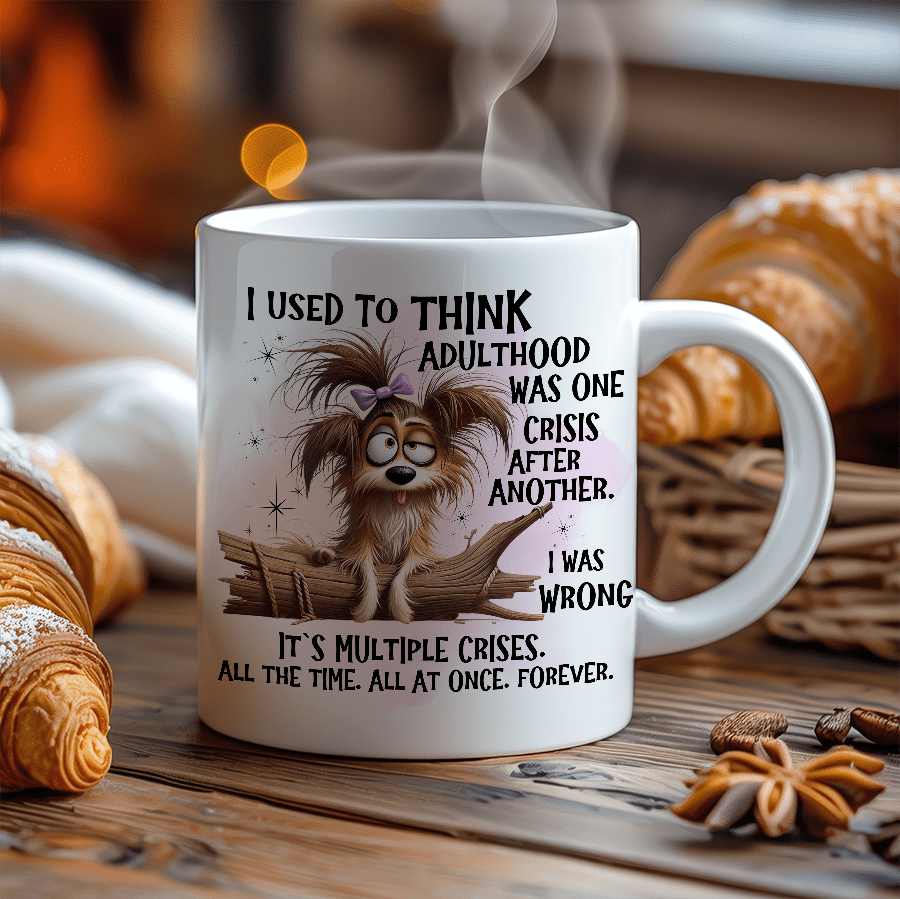 Når voksenlivet føles som en serie kriser, sier denne koppen alt. Motivet viser en hund med verdens mest slitne uttrykk – en humoristisk gave til alle som kjenner seg igjen. Koppen rommer 443 ml og passer til både kaffe, te og kakao.