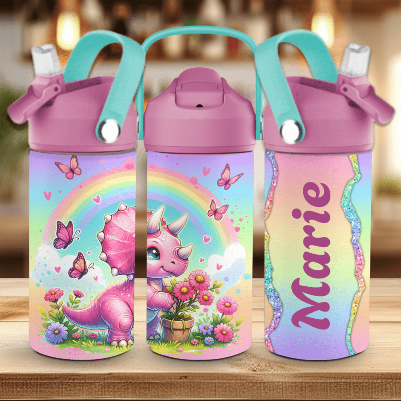 Magisk kombinasjon av dinosaur og regnbue! Denne personlige drikkeflasken med navn er både morsom og fargerik. Du velger selv hvordan navnet skal se ut, og barnet får en helt unik flaske til skolen eller barnehagen. Flip-top tut gjør drikkingen enkel, og flasken holder på temperaturen hele dagen.